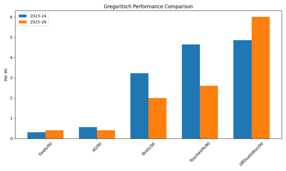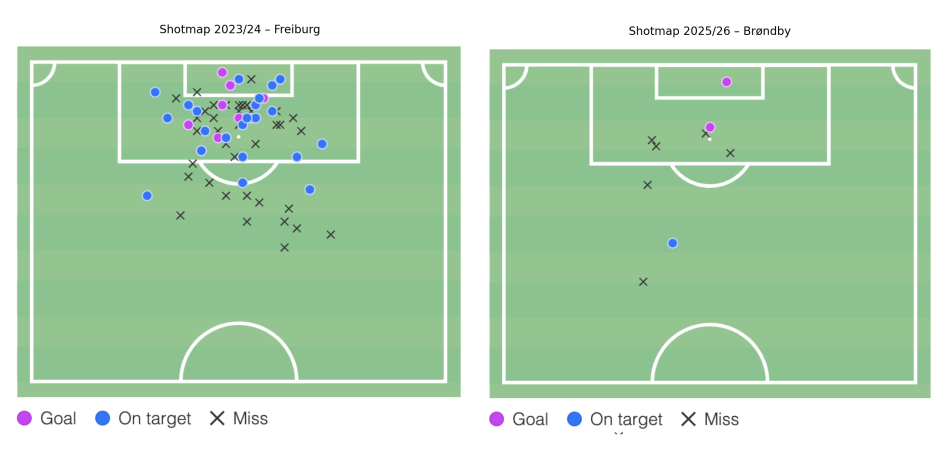Og tallene bakker billedet op. Sammenligner man hans præstationer i Brøndby med sæsonen 23/24 i Freiburg (24/25 bød på for få minutter til en sammenligning gav mening), står forskellene tydeligt frem:
