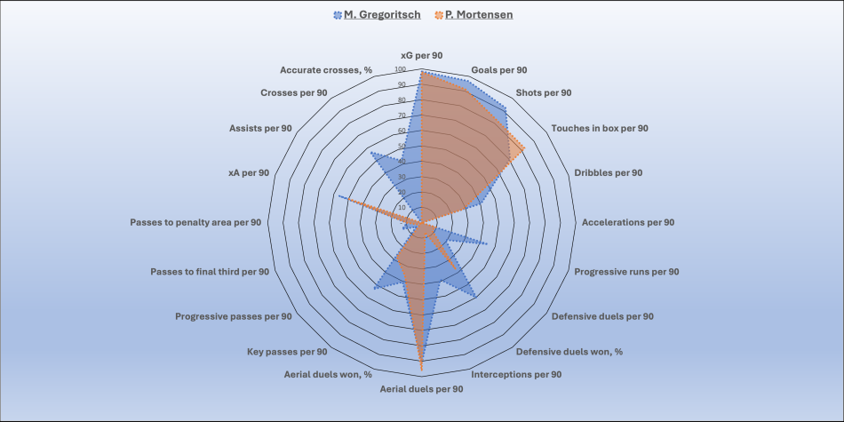 Under Birk var det Filip Bundgaard, der blev brugt som 9’er. En teknisk stærk, bevægelig type. Gregoritsch er det modsatte. Og det kan ses i spilletiden: knap 450 minutter i Superligaen fordelt på fire starter og otte indhop, samt to mål - et på straffe mod FCK og et mod Fredericia. Majoriteten af minutter har unge Jacob Ambæk taget.