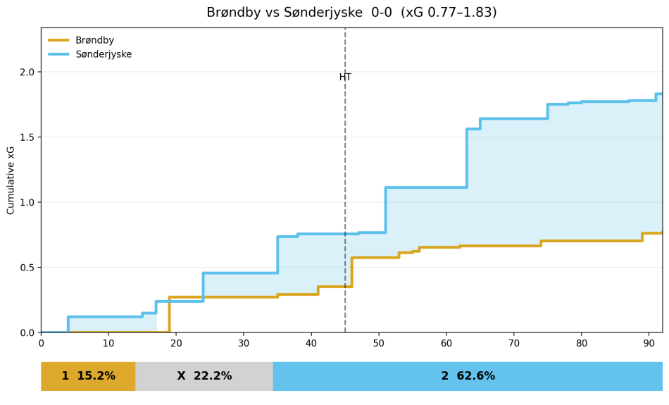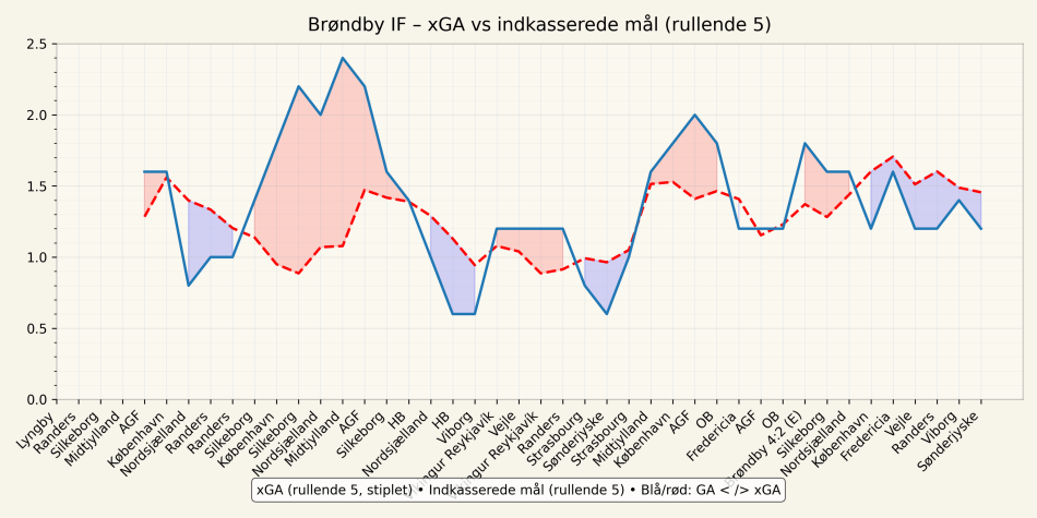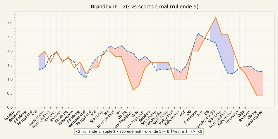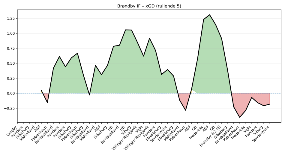 Brøndby ruller med en negativ xG difference i den seneste periode. Med andre ord er der en generelt større sandsynlighed for at tabe point end at vinde, når vi ser på hvad Brøndby selv kan skabe og modstanderne skaber af chancer over tid.