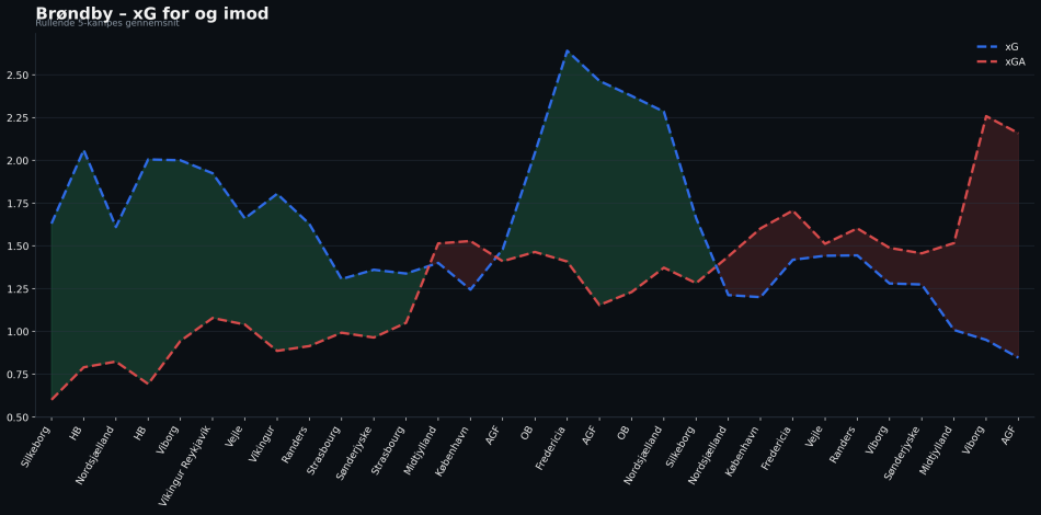 Men dykker man ned i tallene fra september og frem til nu, tegner der sig et klart billede af et hold, der gradvist har mistet noget helt centralt: evnen til at omsætte sit spil til chancer af høj kvalitet. For Expected goals giver en nådesløs vurdering af Brøndbys udvikling: