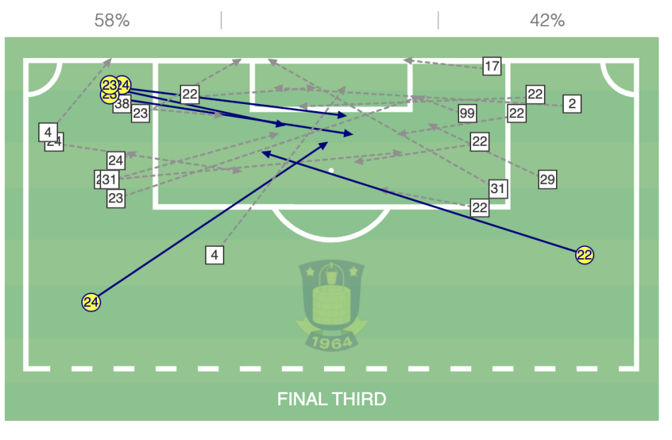 For meget fremadrettet pasningsspil og alt for meget bagudrettet til keeperen. Der kommer for lidt værdi fra Godfrey på bolden. Det sætter et større pres på Binks, der i højere grad har synes frustreret i forsøget på at skulle skabe endnu mere spil fremad.
