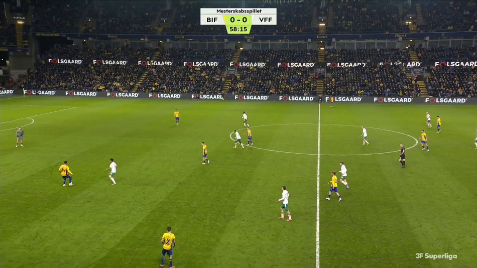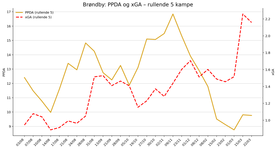 Tallene peger også på en ændring i måden, angrebene bliver sat op på. Brøndby spiller færre fremadrettede afleveringer, færre afleveringer til sidste tredjedel og lidt færre progressive afleveringer end i den gode periode. Samtidig stiger antallet af indlæg markant. Det ligner et hold, der i højere grad end tidligere bliver skubbet ud i siderummene og må forsøge at skabe chancerne gennem volumen frem for gennemspillede gennembrud centralt.