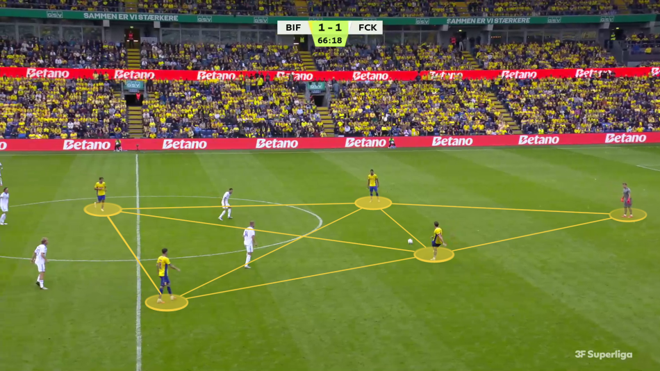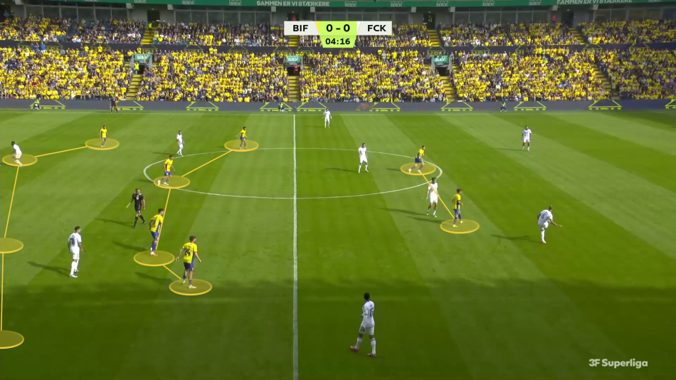Med to 6ere foran giver det muligheden for en komfortabel opbygning, hvor modstanderne tvinges til enten at forblive passive i presset (og give ro til Brøndby) eller gå aggressivt med risiko for at blive spillet forbi og give Brøndby mulighed for at accellere spillet derfra.