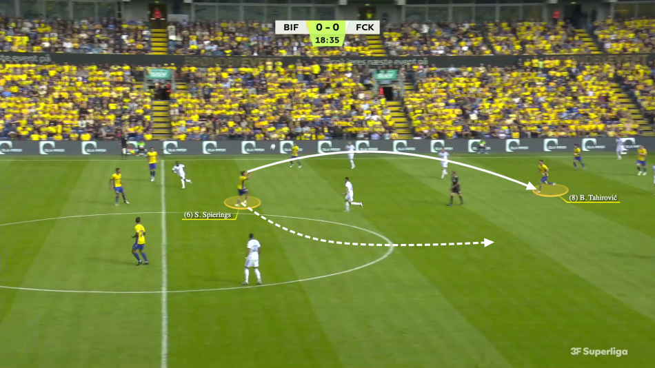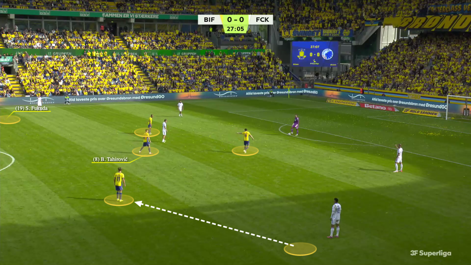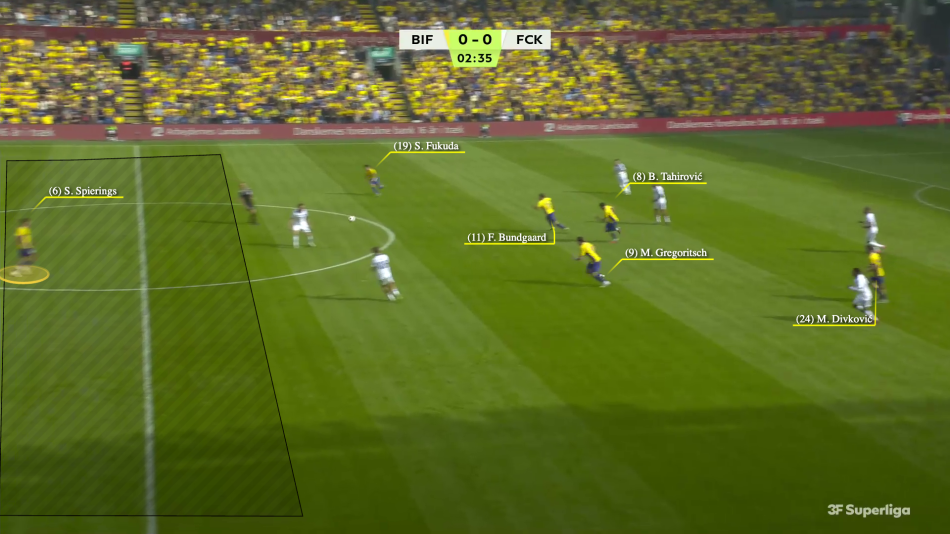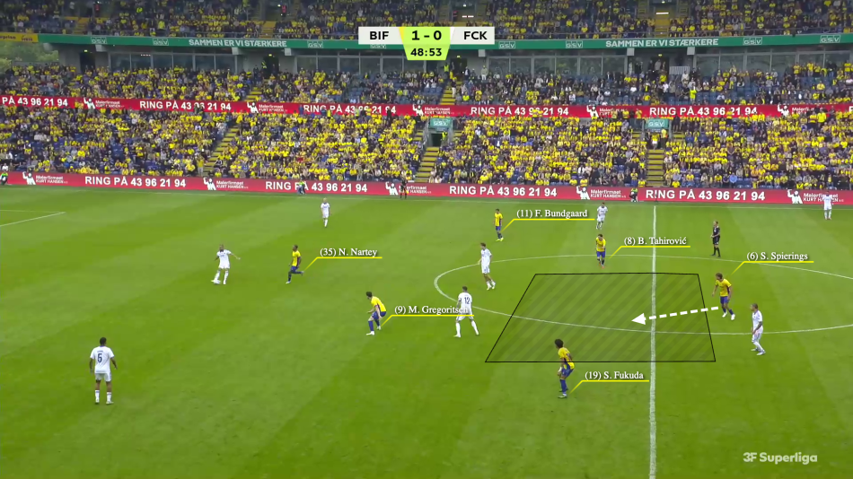 Presset lukkede det centrale rum ned, og FCK blev ofte tvunget ud i siderummene. Her håndterede Brøndby indspil til det centrale område klogt, og fik lukket ned for det meste. Nedenfor vist hvordan Brøndby "skævvred" midtbanen for at lukke FCKs muligheder for at spille bolden ind i mellemrummene. De to wings trak ind og gjorde banens centrale rum pakket.