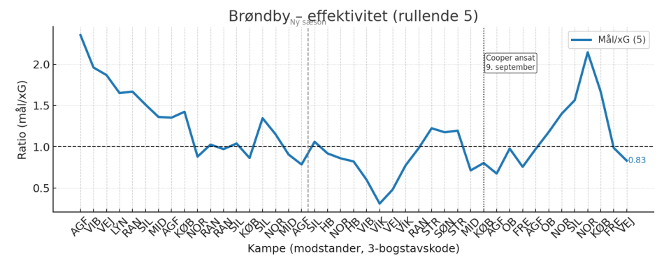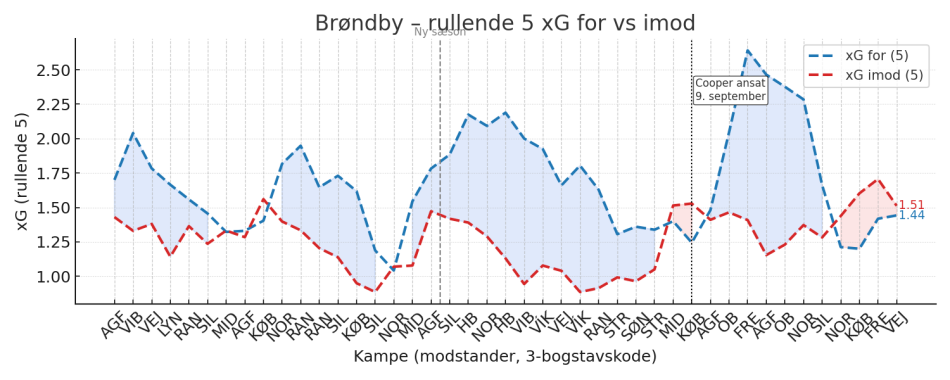 Under Cooper steg den gennemsnitlige xG-produktion fra 1,63 til 1,81 pr. 90 minutter, mens xG imod samtidig steg fra 1,23 til 1,39. Brøndby blev altså bedre til at skabe chancer, men betalte prisen defensivt.