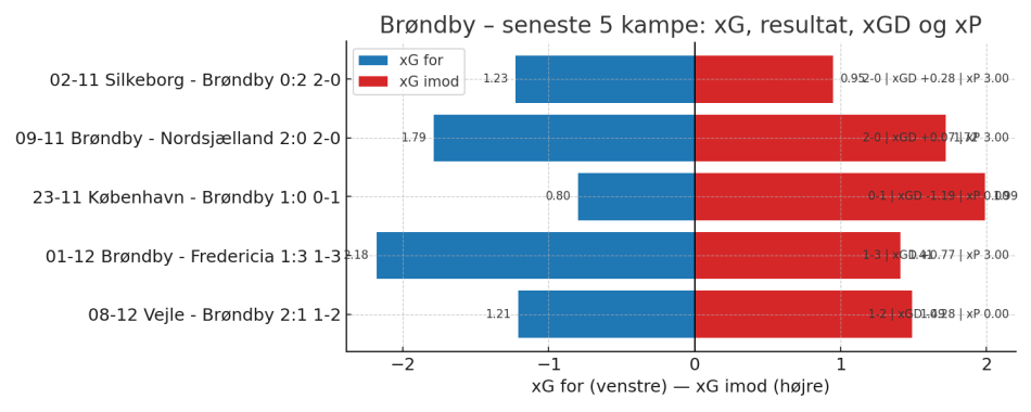 Ser man på performancedata for efteråret, tegner der sig et tydeligt billede. Brøndby startede Coopers periode med en markant offensiv fremgang, men stagnerede gradvist, inden niveauet dykkede markant frem mod vinterpausen.