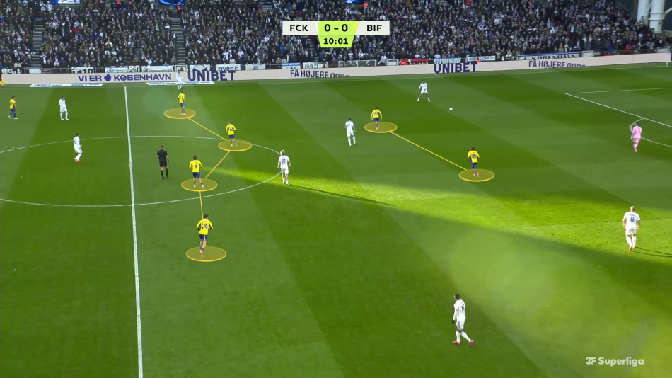 I boldbesiddelse opererer Brøndby med en klassisk 9er forrest, flankeret af to wings og en 10er centralt bag angriberen.