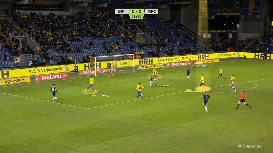 Klaiber mangler bagude, Godfrey må dække af, Mathias Jensen gør ikke arbejdet færdigt og følger med ned, og tvinger Binks i en situation centralt med to modspillere.