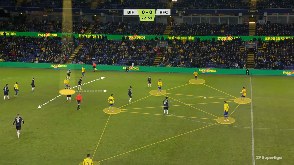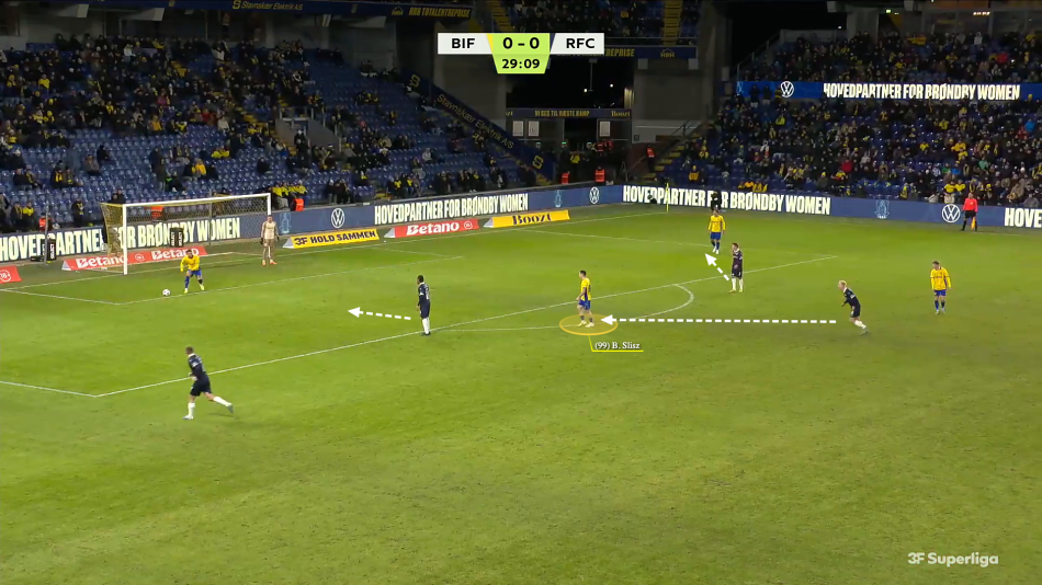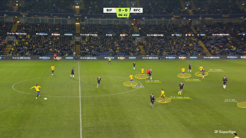 Når Brøndby fik etableret boldbesiddelse højere i banen, blev spillet for stationært. Frøkjær blev låst i den ene halvrum, når Brøndbys midtbanetrekant sendte Mathias Jensen højt i det ene halvrum, mens Slisz lå alene som dyb 6’er. Især når begge kanter, og især Viggo Poulsen, gerne skal trække ind i banen.