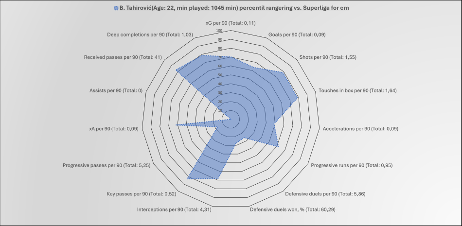 Datamæssigt understøttes det billede: Han markerer sig mere på interceptions (især når vi kigger på, hvad han opnåede mod Randers og holder det op mod hans sæsondata) end på fysiske defensive dueller. Han finder modtagere tæt under modstanderens mål og har blik for den progressive aflevering.