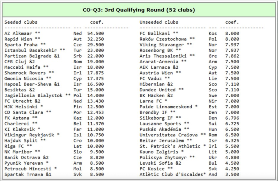 Skulle det utrolige ske, at mange seedede hold ryger ud til lavt rangerede modstandere, kunne både Víkingur og Brøndby pludselig ende i den seedede pulje – men så begynder jeg også at tro på julemanden igen. 9 ud af 13 af de hold på billedet over der har en eller flere ' * ' ud fra sit navn, skulle tabe og ryge ud. Det virker meget usandsynligt.