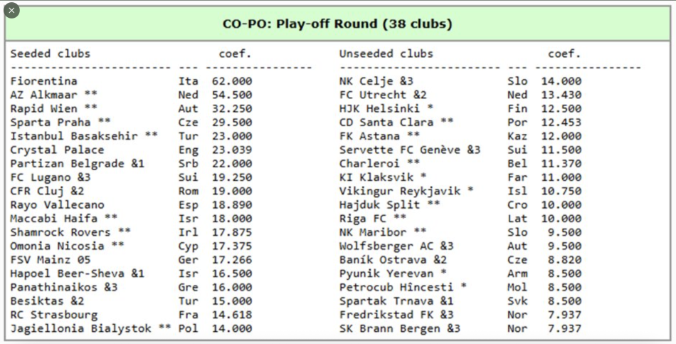 Der ville være enkle skrækmodstandere, men også nogle hvor der ville være gode muligheder. Hvis du undrer dig over, hvordan et hold som Crystal Palace eller Mainz er i den seedede pulje, når de ikke har spillet Europa i langt tid -Her kan man se, at visse klubber som Crystal Palace eller Mainz er seedet, fordi UEFA har en regel om, at en klub aldrig må have mindre end 20 % af landets koefficient.