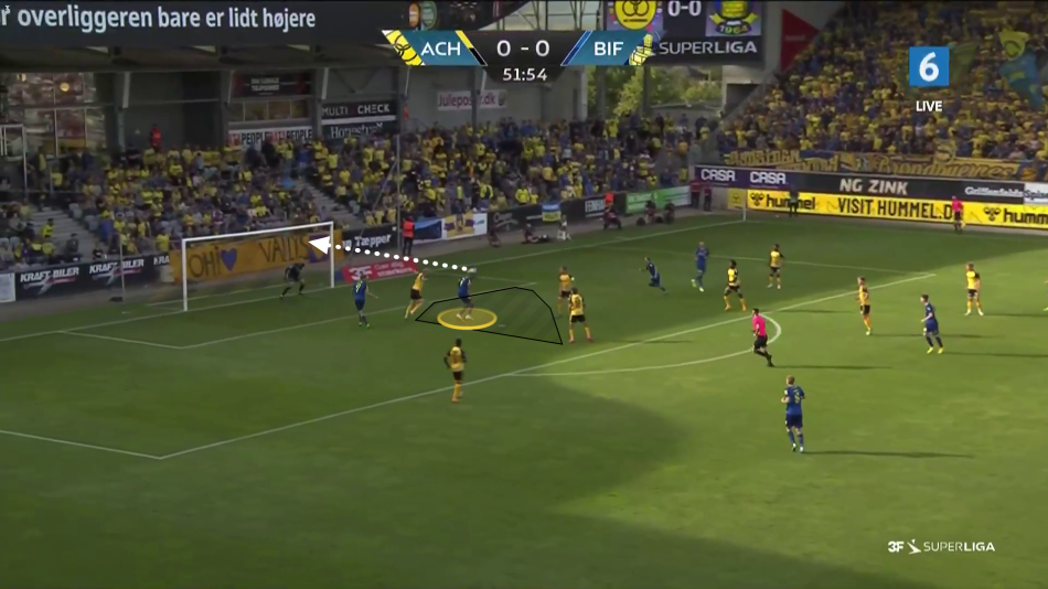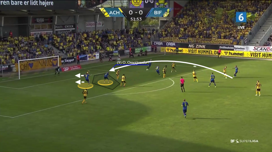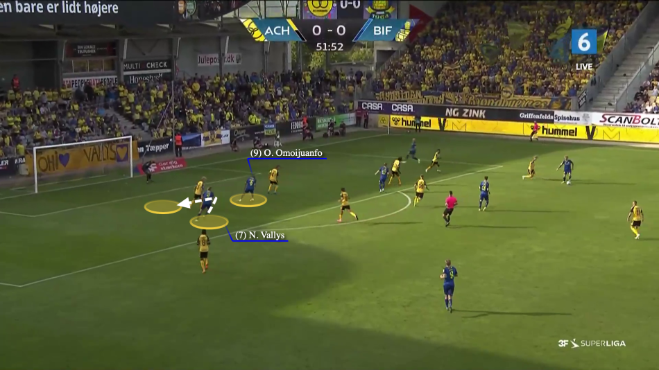 Omoijuanfo placerer sig klogt mellem stopperne, men det der også betyder noget er Vallys' løb i feltet. De blågules nummer 7 faker et løb mod midten, for så at løbe i ryggen på Magnus Jensen, det trækker stopperen med mod bagstolpen, og efterlader et perfekt rum til Omoijuanfo.