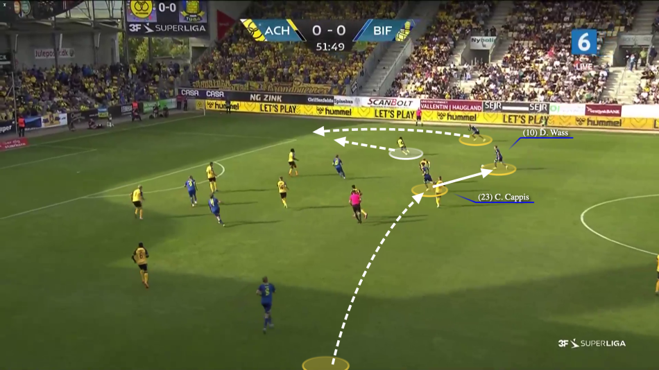 Den midtbanespiller som ellers lige var gået i pres på Cappis er derfor tvunget til at sprinte retur, og gå i et forceret pres på Wass, der dog rutineret laver en skudfinte og trækker bolden retur til sit venstreben.