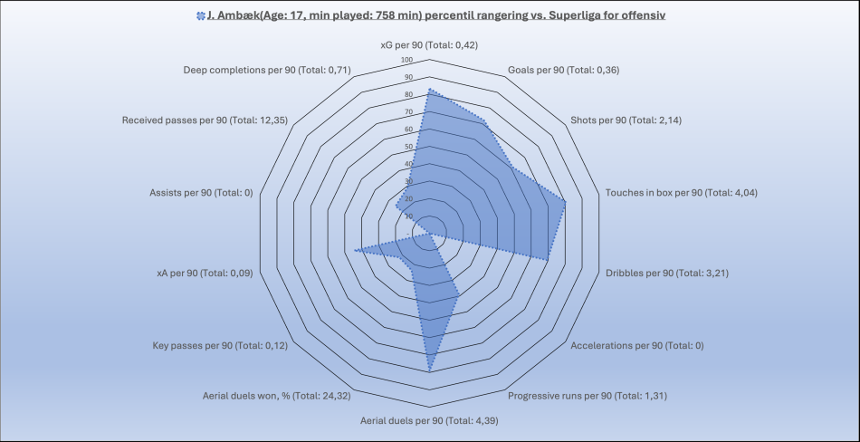 Tallene understøtter billedet af en spiller i klar fremgang. Ambæk ligger på 0,42 xG pr. 90 minutter - et niveau, der placerer ham i den næstbedste gruppe blandt offensive spillere i Superligaen - og han scorer 0,36 mål pr. 90 minutter.