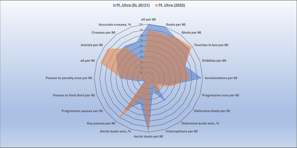 Kigger man på hans data fra 2020/21-sæsonen i Brøndby og sammenligner med hans MLS-produktion frem til 2025, åbner billedet sig lidt.